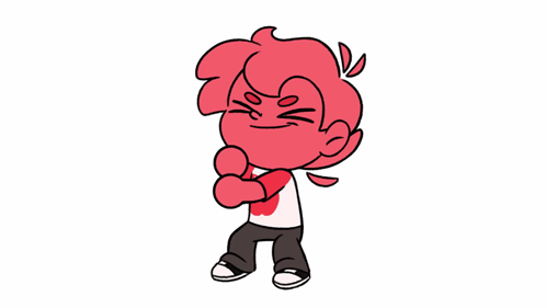 Red-skinned, red-haired cartoon character with a red heart shirt, smiling mischievously.