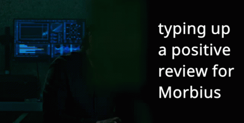 Jared Leto as Morbius types a positive review for the movie, surrounded by glowing computer screens.