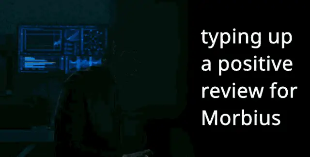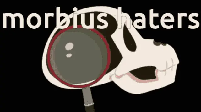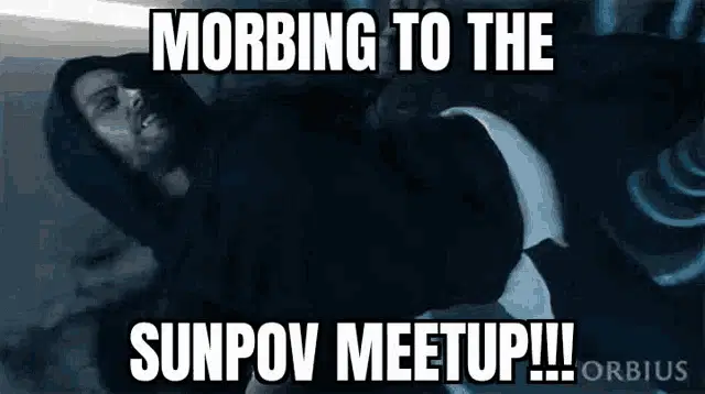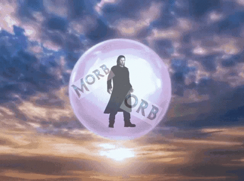 A man resembling Morbius stands inside a transparent orb with "MORB ORB" written on it, floating through various sky and space backgrounds.