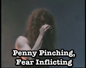 Overkill's 'Penny Pinching, Fear Inflicting' text displayed over a man's image, reflecting the metal band's theme.