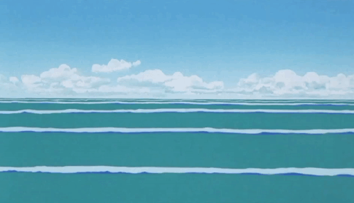 Vast anime-style sea with gentle waves under a clear blue sky with scattered white clouds.