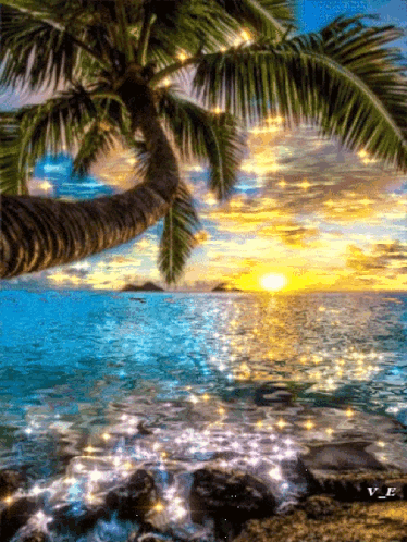 Pyotr Nikitin's vibrant tropical sunset scene with a palm tree overlooking a sparkling ocean.