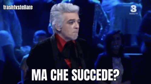 Italian singer Morgan on stage, asking 'Ma che succede?' during a performance, likely at Sanremo 2020.