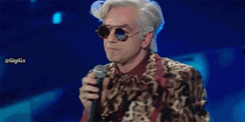 Morgan, wearing a leopard print suit and sunglasses, asks 'Che succede?' while holding a microphone at Sanremo 2020.