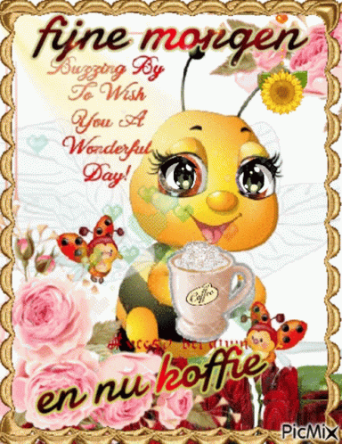 A cute bee holding a coffee cup, surrounded by flowers and ladybugs, wishing a wonderful good morning.