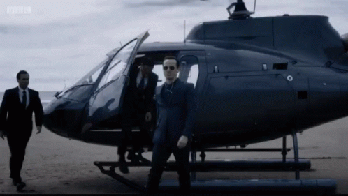 Moriarty exits a helicopter on a beach, spreading his arms in a triumphant and free gesture.