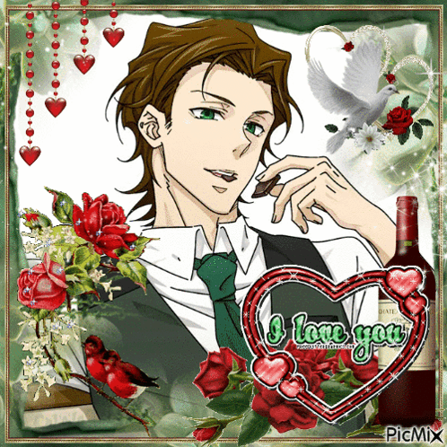 A charming image of Albert James Moriarty from Moriarty the Patriot, surrounded by roses and hearts.