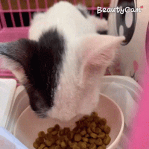 Mormor, a cute black and white cat, enjoys a meal from a pink bowl, captured with a BeautyCam watermark.