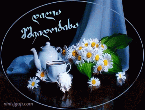 A serene morning scene featuring chamomile, daisies, and a cup of coffee, with the ninisjgufi.com website.