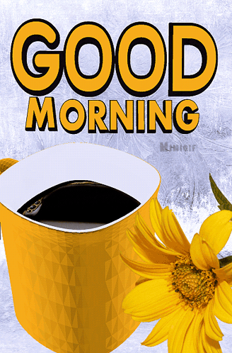 A vibrant 'Good Morning' greeting featuring a yellow cup of black coffee and a bright yellow flower.