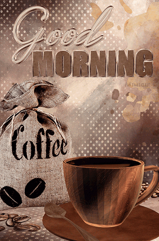 A warm 'Good Morning' message accompanied by a burlap bag of coffee beans and a ready-to-drink cup of coffee.