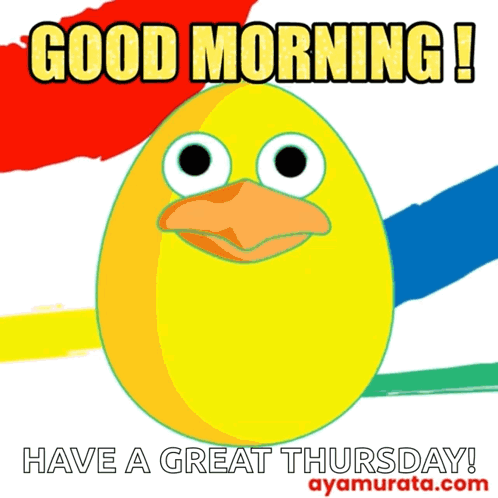 Animated graphic wishing 'Good Morning!' and 'Have a Great Thursday!' with a chicken hatching from an egg.