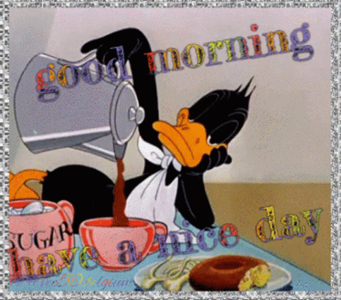 A classic cartoon duck pours a fresh cup of coffee, accompanied by a cheerful 'Good Morning, Have a Nice Day' message.