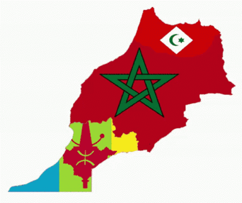 A detailed map of Morocco, including Western Sahara, featuring the national flag and various Amazigh and regional symbols.
