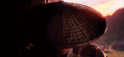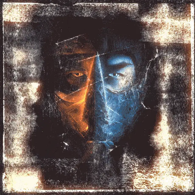Raiden from Mortal Kombat 1 reveals his face, his eyes glowing red against a sunset backdrop.
