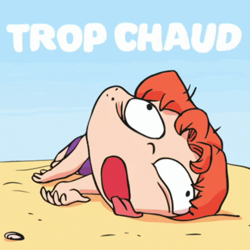 Mortelle Adèle cartoon shows her lying on a sandy beach, clearly suffering from the heat with 'Trop Chaud' text.