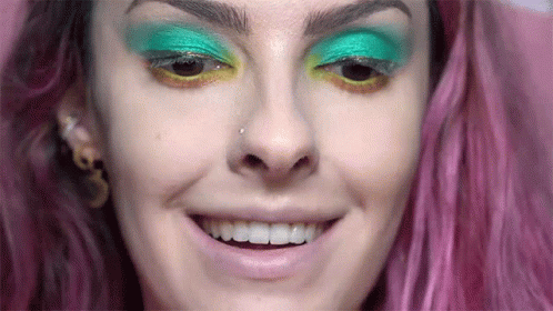 Karen Bachini sticking out her tongue, showcasing vibrant green and yellow eyeshadow and pink hair.