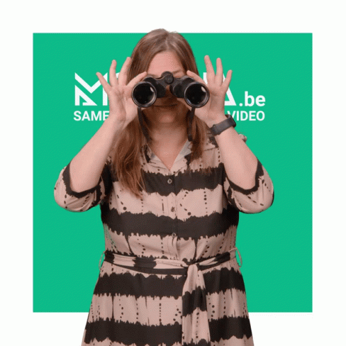 Motcha Madebymotcha looks through binoculars, scanning left and right against a green screen.