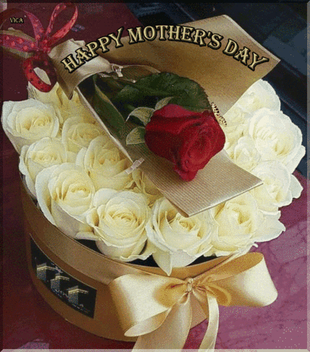 A beautiful arrangement of white roses and a single red rose, with a 'Happy Mother's Day' message.