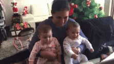 A mother lovingly holds her twin babies, Catalina and David, on a couch, with a festive Christmas tree in the background.