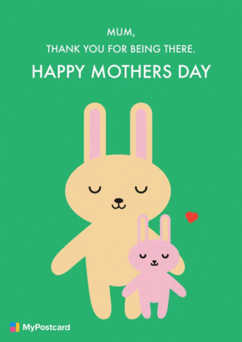 A vibrant Mother's Day card featuring two cute cartoon rabbits and a heartfelt message for Mum.