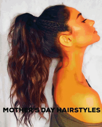 Woman with braided ponytail showcasing Mother's Day hairstyles with a sale offer.