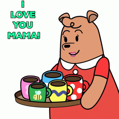 A sweet cartoon bear holds a tray of coffee cups, wishing "I Love You Mama!" for Mother's Day.