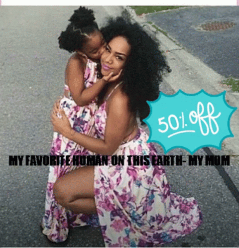 A heartwarming image of a mother and daughter in matching floral dresses, celebrating Mother's Day with a 50% off hair sale.