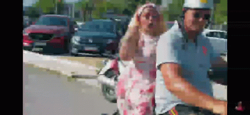 Iren riding a motor scooter on a sunny street, with cars parked nearby.
