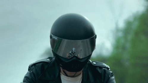 A person rides a motorcycle, wearing a black Simpson helmet and leather jacket, with a nod to The Tragically Hip.
