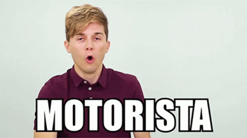 Gato Galactico makes a funny face in front of a sign that says 'Motorista'.