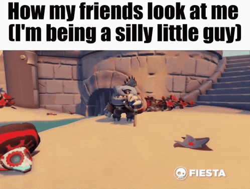 Skylanders character Sharpfin with meme text: 'How my friends look at me (I'm being a silly little guy)'.