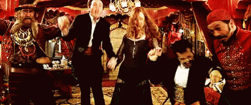 Christian and Satine lead an excited dance in a vibrant Moulin Rouge cabaret scene, full of energy.