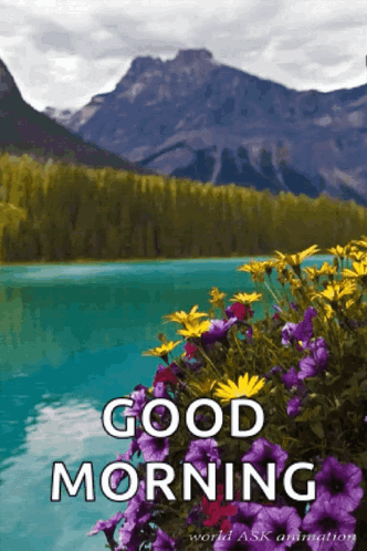 Scenic mountain lake with vibrant flowers and a 'Good Morning' message.