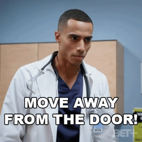 Tom Brooks, a doctor, sternly tells someone to move away from the door in a medical setting.