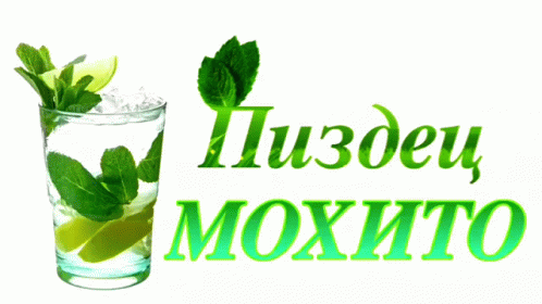 A refreshing mojito cocktail with mint and lime, featuring the Russian text 'Пиздец МОХИТО'.