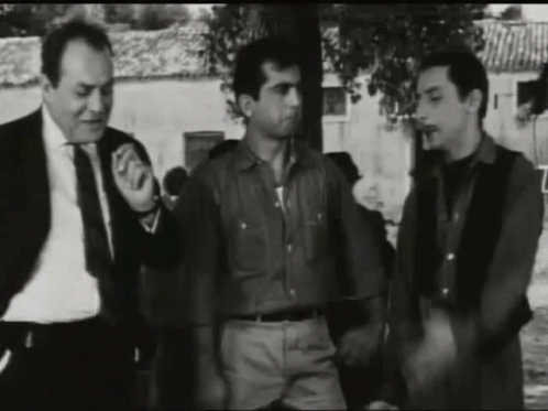 Three men in a black and white scene performing the traditional Greek 'moutza' gesture.
