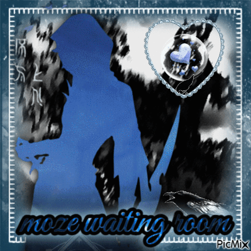 Moze from Honkai Star Rail in a waiting room scene, featuring a blue silhouette and animated birds.