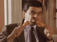 Mr Bean in a suit and tie, eating with a mischievous expression.