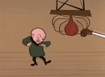 Mr Magoo reacts with exaggerated movements as a boxing glove repeatedly hits a punching bag.