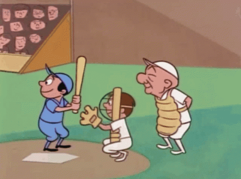 Mr. Magoo serves as the umpire in a classic cartoon baseball game, overseeing the batter and catcher.