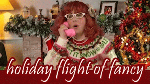 Mrs Braithwaite Pegret on a holiday call, wearing a 'LET IT SNOW' sweater in a festive room.