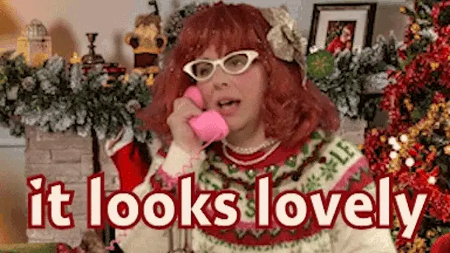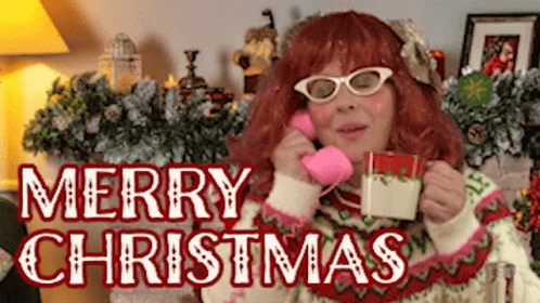 Mrs Braithwaite Pegret celebrates Christmas, holding a pink phone and a festive mug.