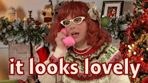 Mrs Braithwaite Pegret in a Christmas sweater talks on a pink phone, with the caption "it looks lovely".