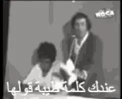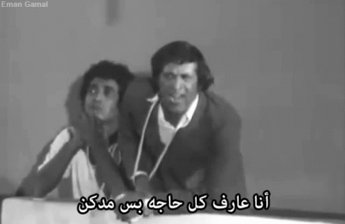 Morsi El Zanaty from the play 'Madrasat Al-Mushaghibeen' with a friend, in a black and white scene.