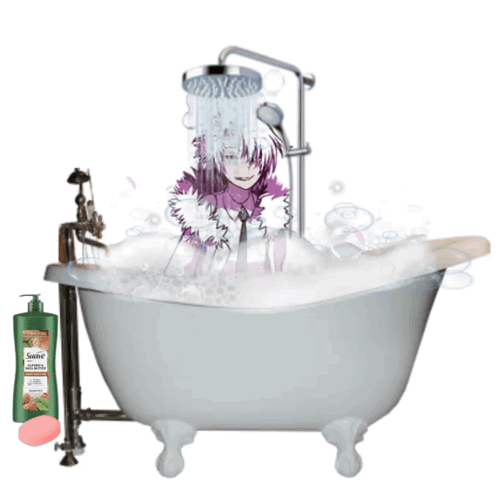 Mrtk Marutoku enjoys a relaxing bubble bath with a shower, shampoo, and soap.