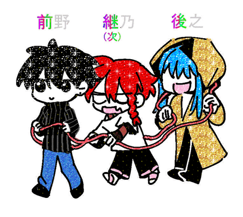 Dynamic animated art from Mrtk Marutoku, featuring Aki Maeno, Fuyu Ushirono, and Haru Tsugino.