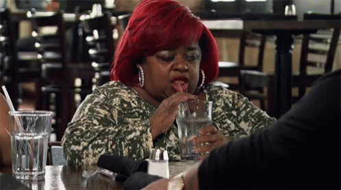 Ms Juicy Baby, with vibrant red hair, sips water through a straw at a restaurant table.