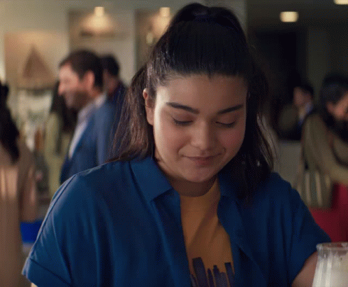 Iman Vellani as Kamala Khan reacts to eating spicy Pani Puri, showing a strong reaction to the heat.