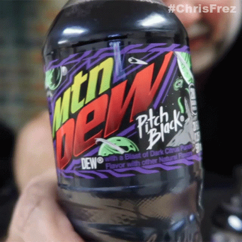 Chris Frezza holds up a bottle of Mtn Dew Pitch Black, showcasing the dark soda and its distinctive label.